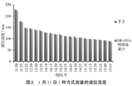見圖3,以手工實(shí)測(cè)液位高度為基準(zhǔn),2種流量計(jì)的誤差均在±5%的范圍內(nèi)。除在1月9日14:40和14:45兩個(gè)時(shí)間點(diǎn)測(cè)量值表現(xiàn)出DR-831A測(cè)量誤差高于TKL-Ⅰ外,其他時(shí)段都明顯表現(xiàn)出DR-831A測(cè)量誤差小于TKL-Ⅰ。