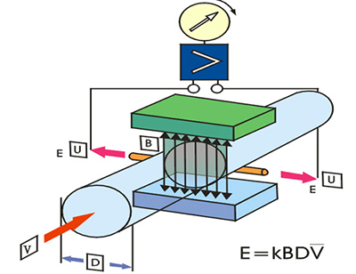 當導電液體沿測量管在交變磁場與磁力線成垂直方向運動時,導電液體切割磁力線產生感應電勢。在與測量管軸線和磁力線相互垂直的管壁上安裝了一對檢測電*,將這個感應電勢檢出。